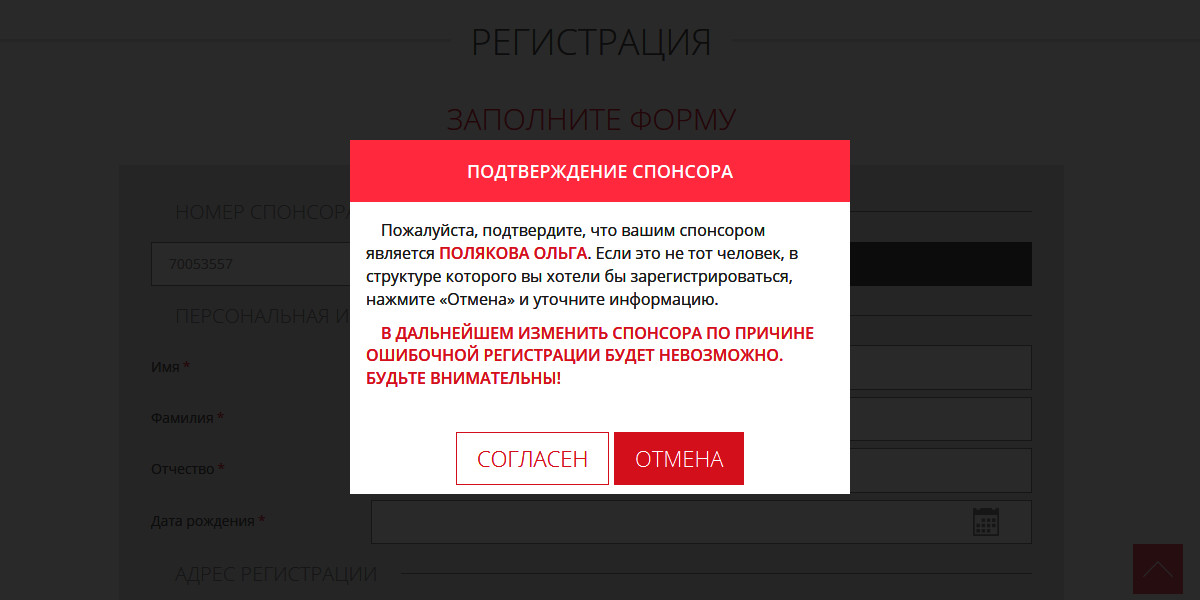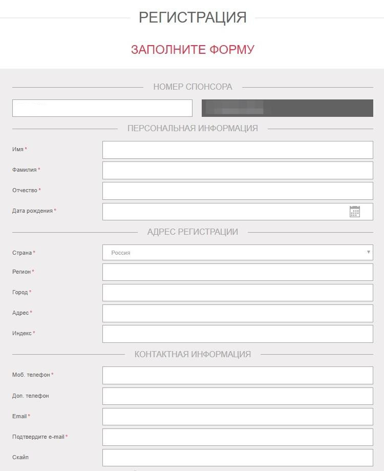 Строка НОМЕР СПОНСОРА обязательна для заполнения. В этой строке указывается НОМЕР СПОНСОРА 70053557 - это мой номер дистрибьютера или вы можете указать любой другой который у вас есть, без него регистрация будет не возможна!